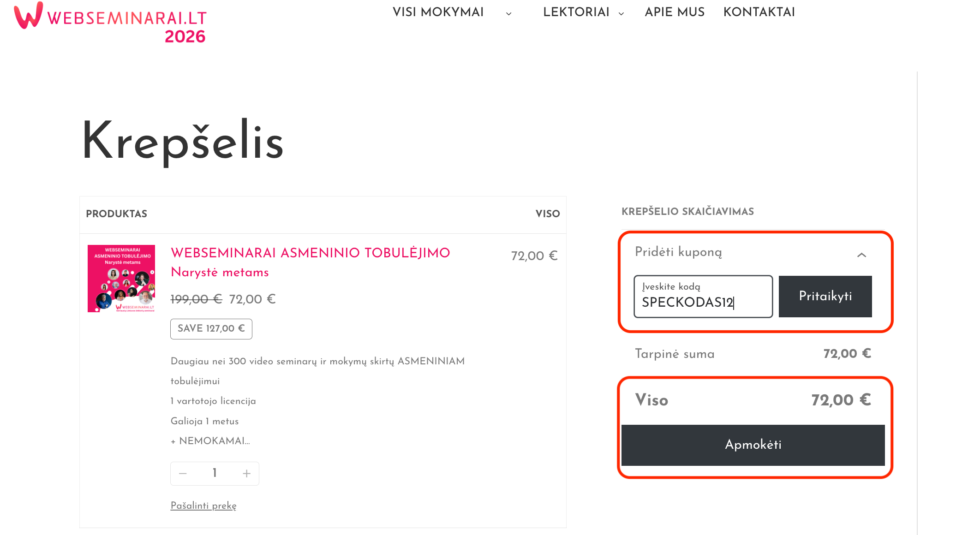 2. Skiltyje „Pridėti kuponą” suveskite Jūsų kupono kodą, suma turėtų tapti 0 Eur.